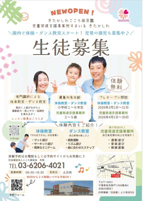 2026年4月1日に開園する「きたかしわこころ保育園」で課外教室・児童発達支援事業所の無料体験会を実施します!詳細は下記フォームよりご確認ください!